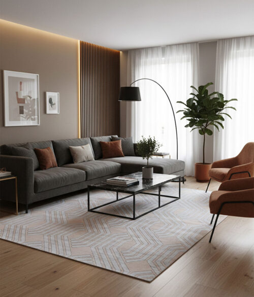 Simple design rugs like neutral-toned, striped, or abstract patterns are ideal for a modern home.